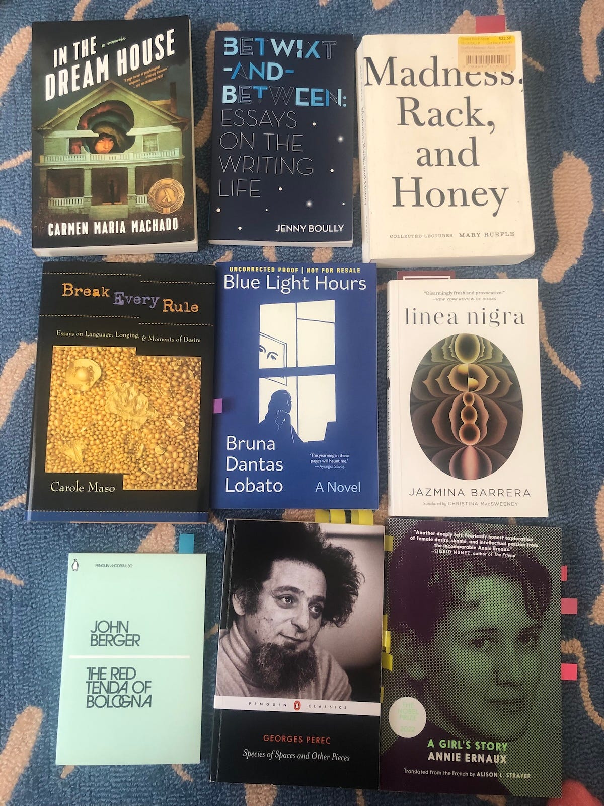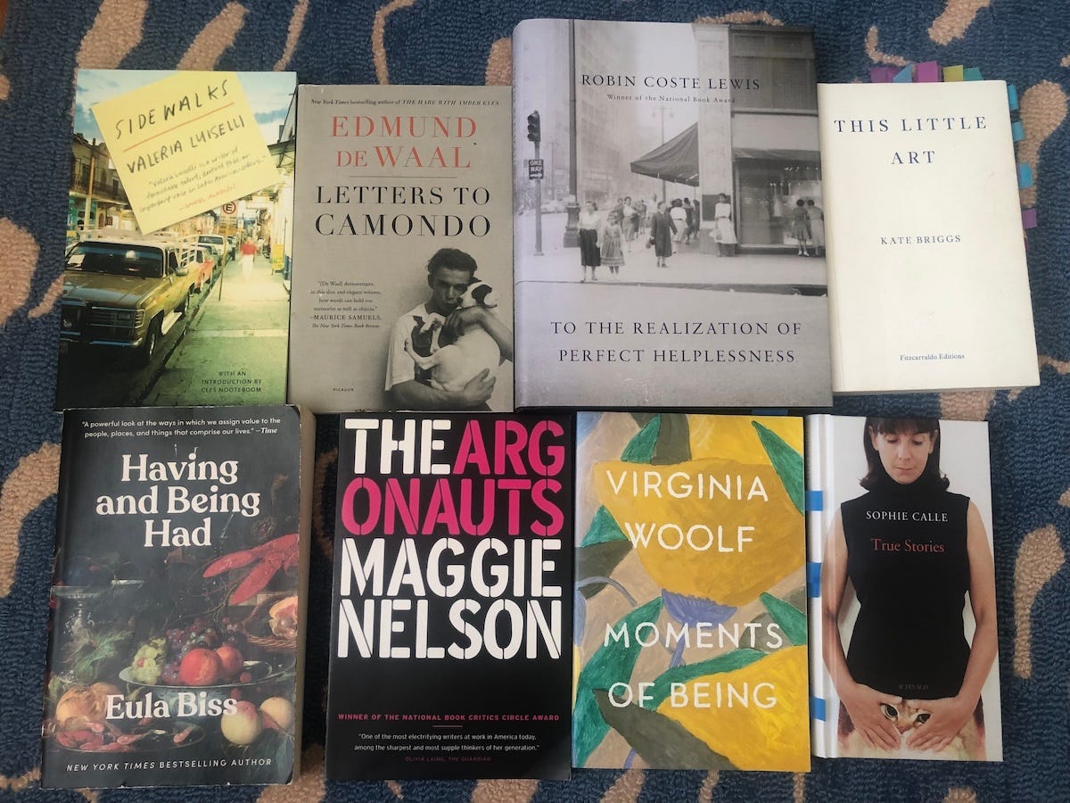 These notes and quotes help ground me and are reminders of what matters to me. I’ve also gotten back into the regular habit of writing in a notebook again, physically jotting down ideas and thoughts as they come to me, rather than believe I’ll remember them later (another repeated bit of advice I heard at Bennington). Below are some of the books I loved reading & rereading during my program.